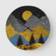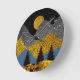 design de paisagem da montanha abstrato em tons de ouro, preto e azul em tons negros, com um luar e pássaros.