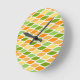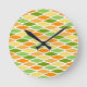 Este relógio de parede tem um design moderno século médio de diamantes achatados em tons de amarelo, laranja e verde.