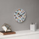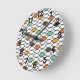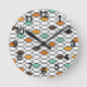 Este relógio de parede tem um design retroativo de ovais nos anos 70 em branco, marrom, azul e dois tons de laranja.