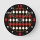 Os diamantes vermelhos esboçados em ouro destacam este design de harlequin preto e branco. Números em um fundo preto facilitam a contagem do tempo. Os números vermelhos maiores marcam a cada trimestre de hora.