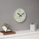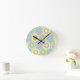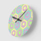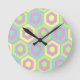 Este relógio tem um design geométrico de hexágonos em azul pálido, amarelo pálido e verde pálido num campo de listras em rosa pálido e roxo pálido.