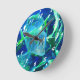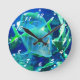 Peixe tropical no relógio de parede azul com números brancos itálico.