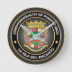 O emblema nacional de Porto Rico está no centro de uma design circular. A cor de fundo é um gradiente preto/branco radial, e em volta das costelas dos círculos, uma cor falsa de ouro. O texto sobre a design apresenta o título oficial de Porto Rico, enquanto o texto de baixo é o lema, que se traduz como a Ilha do Encantamento.