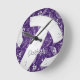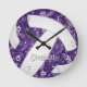 Esse relógio temático de vôlei apresenta a imagem realista de um vôlei com painéis roxos e brancos que têm um padrão de rabiscos de paisagistas, flores e penas em branco cobrindo os painéis roxos do vôlei mais os números da face do relógio - personalize com o nome do atleta - de katz_d_zynes