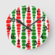 Este relógio da parede de Natal tem um design moderno do século médio de retângulos rochosos vermelhos e verdes em tamanho crescente e decrescente correndo verticalmente num campo de branco.