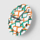 Este relógio de parede tem uma design moderna do século médio de retângulos mastigados com buracos brancos em tons de lacre e tons de laranja.