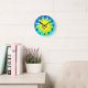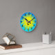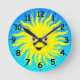 Uma imagem do Sol num céu azul. Um dia brilhante ensolarado! Personagem de desenho animado. Esta versão do relógio da parede tem um discagem.