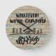 Uma frase engraçada "O que quer que seja, estamos acampando" em um fundo rústico de planks de madeira derivada.