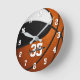 Este relógio personalizado da parede de basquetebol apresenta a imagem realista de uma bola de basquete que tem dois painéis recoloridos - um preto e um branco - com números superficiais da face do relógio - personaliza com o nome do jogador em uma fonte do estilo "autógrafo" sobre o número de camisa do atleta - por katz_d_zynes