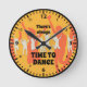 Na moda colorida TIME TO DANCE Wall Clock, mostrando gráficos de silhuetas dançantes. O esquema de cores é amarelo-sol, laranja e creme. Adequado para um tema de cor vibrante. O texto diz que sempre há tempo para dançar na tipografia negra. O texto é PERSONALIZÁVEL para que você possa substituí-lo por texto ou nome de tamanho semelhante. Disponível em outras cores.