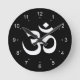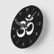 Este relógio simples e elegante apresenta um símbolo branco "Om" e números sobre um fundo preto.