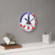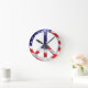 Adicione uma decoração de arte única à sua casa, sala ou parede de escritório com um relógio de parede redonda. Vermelho, branco e azul das estrelas e listras da bandeira americana no Símbolo da Paz. Na moda, Trabalho de arte único e decorativo.
