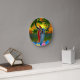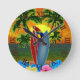 Um oceano tropical e colorido atrás de pranchas de surfe, palmeiras, papagaios de arara poados nos conselhos surfs e flores de hibisco no fundo.
