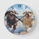 Two labrador retrievers runs towards the viewer on a sandy beach. One is yellow second is chocolate. The background features a clear blue sky with fluffy white clouds, a sparkling blue ocean with whitecaps, and a green shoreline. Perfect gift for labrador lovers.