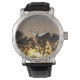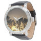 reloj con fondo de imagen de una pesta de sol entre arboles.