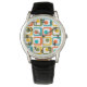 Este relógio masculino tem um design moderno do século médio de quatro retângulos arredondados em quatro filas com ovais dentro em laranja, amarelo, verde e turquesa.
