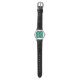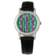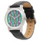 Este relógio tem um design moderno do século médio de retângulos roxos, verdes e azuis, de neon, em tamanho crescente e decrescente, correndo verticalmente num campo de preto.