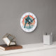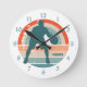 Neste relógio atraente, um jogador de basquete da silhueta azul é colocado sobre um círculo retrô em arco-íris de faixas em apuros. Um campo de nome personalizado em azul correspondente está no canto inferior direito. A correspondência de números azuis facilita a leitura do relógio.