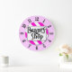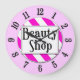 Um relógio de parede único lendo Beauty Compra em letras retrógradas em um fundo listrado rosa e branco cercado por números pretos em um rosto rosa. Clique em Personalizar para alterar as cores do plano de fundo e muito mais, até mesmo para salvar o design para mais tarde.