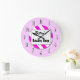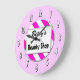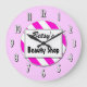 Um relógio de parede único lendo Compro Beauty em letras de bloco com espaço para o seu nome em um script retroativo em um fundo listrado rosa e branco cercado por letras brancas e pretas em rosa.