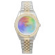 Este elegante relógio de tonalidade prateada e dourada apresenta as réplicas de trabalho de arte digital de Sam Vacik em cores vibrantes em um design gráfico.