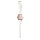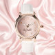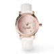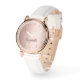 Uma cor de fundo rosa dourada. Adicione um nome, data. O nome é escrito com um script de estilo manuscrito.