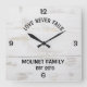 Crie um relógio de parede personalizado da família com as palavras "Love Nunca Fails" com um design de prancha de madeira rústico e country A amostra é mostrada no quadrado de 10,75 polegadas na página de pedidos.