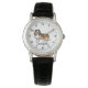 A ilustração original do desenho de Destei de um cachorro Shetland Sheepdog e Sheltie. Há também uma área de texto personalizável para um nome. A face do relógio é feita de números pretos.