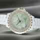 This elegant bridal timepiece features a soft sage green watercolor dial accented with warm gold details, framed by a sparkling crystal bezel and finished with a glossy white enamel bracelet. The refined color palette evokes purity, romance, and understated luxury—perfect for weddings, nikah ceremonies, and meaningful bridal gifting.