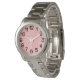 Este relógio feminino tem uma design de Arte Deco de linhas curvas de salmão em forma de triângulo num campo de branco repetido através da design.