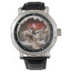 This unique watch face showcases an enchanting winter wonderland. Santa Claus stands centrally in a festive, snow-covered village, surrounded by fir trees and quaint cottages. This decorative timepiece beautifully captures the magical spirit of Christmas, making it a vivid and artistic illustration perfect for holiday charm and celebration. It's a classic and beautiful design detail.