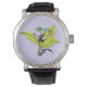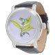 Um sapo de árvore vermelho giro se senta sobre três folhas contra um pano de fundo roxo claro