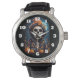 Um relógio com uma ilustração de um esqueleto vestindo uma jaqueta encapuzada com um chapéu de bruxa laranja em cima. Cercado por abóboras giras e assustadoras. Uma lua brilhando nas costas com um morcego solteiro voando perto. Design de Halloween de outono divertido.