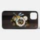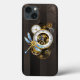 Marcações antigas com engrenagens de ouro e latão, decoradas com libélula mecânica sobre fundo castanho e listrado. Steampunk.