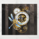 Marcações antigas com engrenagens de ouro e latão, decoradas com libélula mecânica sobre fundo castanho e listrado. Steampunk.