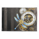 Marcações antigas com engrenagens de ouro e latão, decoradas com libélula mecânica sobre fundo castanho e listrado. Steampunk.