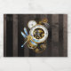 Marcações antigas com engrenagens de ouro e latão, decoradas com libélula mecânica sobre fundo castanho e listrado. Steampunk.