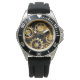 Marcações antigas com engrenagens de ouro e latão, decoradas com libélula mecânica sobre fundo castanho e listrado. Steampunk.