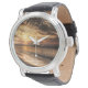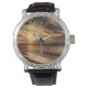 Foto impressionante da paisagem do nascer do sol sobre uma praia com um dramático céu nublado em contraste com a água calma.