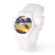 Um relógio com foto de um pôr do sol.
