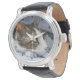 O recurso neste relógio de pulso de arte é uma pintura original de óleo "Antecipação" do artista prêmio Debra Mickelson. A imagem é um retrato de um belo gato-do-mato marrom e branco com lindos olhos amarelos. Ao redor do perímetro do relógio estão pequenas patas de gatos pretos que segmentam intervalos de cinco minutos de tempo. As imagens de pata de gato são personalizáveis, portanto, se você preferir excluí-las, você pode fazer isso limpando o campo.
