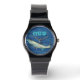 Pescar temido, relógio de tarpon para o pescador. Imagem de Tarpon com design de água azul e três iniciais de monograma em azul brilhante. Presente perfeito para qualquer pescador de alto mar. Esta pulseira preta é uma das muitas opções de banda e face para um relógio masculino. Escolha o que você prefere.
