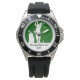 Relógio masculino de diversão com tema de golfe projetado com um gráfico de golfe balançando um clube de golfe em uma design de na moda minimalista em um design.