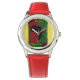 Adicione um toque étnico ao seu pulso e represente com este belo relógio decorado com uma silhueta da terra-mãe apoiada pelas cores rasta do vermelho, ouro e verde.