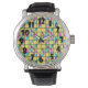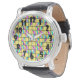 Este relógio masculino tem uma design moderna do século médio de luas em crescente dividida horizontalmente em três cores, rosa, azul, lavanda, ou marisca, dividida ao meio e espalhada em uma grade com fundo amarelo. Se você gosta do design, mas quer cores diferentes, me mande mensagem.