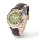 Este relógio feminino tem uma design moderna do século médio de retângulos verdes arredondados com buracos sobre um fundo de listras em cores modernas do século médio. Se você gosta do design, mas prefere cores diferentes, me mande mensagem.