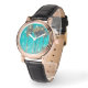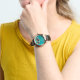 Um relógio com uma bela fotografia. Palmeiras altas com troncos longos e finos em frente a um lindo céu verde. Esquema de cor retrorativa. Relaxando e relaxando.