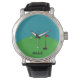 Fundo moderno azul e verde, bola de golfe branca e bandeira vermelha. Ideia de presente de excelente para o Dia do Pai, aniversário, golfe e amantes do esporte, Mude o nome clicando no botão personalizar.