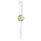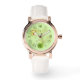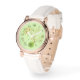 Um relógio verde de pistão na moda, misturando elegância e naturalidade com flores delicadas e caindo folhas para um olhar macio e encantador.