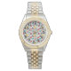 Este relógio feminino tem uma design moderna do século médio de uma grade de linhas pretas com quadrados e retângulos em cores retrorativas em um campo de branco.